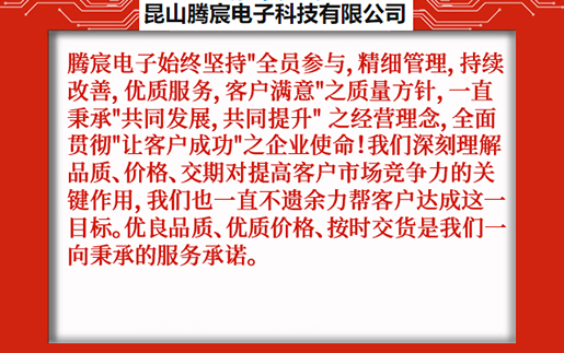 昆山騰宸電子科技有限公司位于中國線路板加工之都昆山千燈,公司專注于電路板研發(fā)設計、PCB抄板、元器件采購、SMT貼片加工、組裝測試,為客戶提供一站式電子制造服務。騰宸電子始終堅持"全員參與,精細管理,持續(xù)改善,優(yōu)質(zhì)服務,客戶滿意"之質(zhì)量方針,一直秉承"共同發(fā)展,共同提升" 之經(jīng)營理念,全面貫徹"讓客戶成功"之企業(yè)使命!我們深刻理解品質(zhì)、價格、交期對提高客戶市場競爭力的關鍵作用,我們也一直不遺余力幫客戶達成這一目標。優(yōu)良品質(zhì)、優(yōu)質(zhì)價格、按時交貨是我們一向秉承的服務承諾。 ...